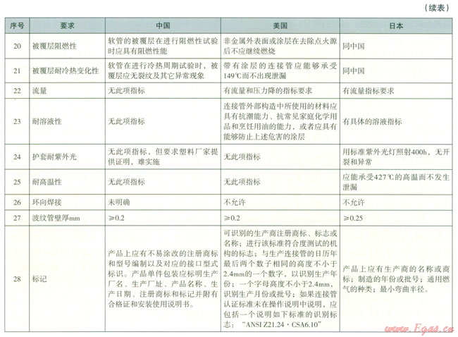 (6)對耐溶液性我們的標準沒有明確要求,美國和日本標準都有要求,我們需要根據(jù)我國的實際制定相關(guān)的要求,包括耐紫外光,建議在以后標準修訂時,能夠參考日本的標準制定適合我國國情的相關(guān)要求,如耐溶液性除了常用的油鹽醬酷外,包括清潔用的除油劑和洗滌劑,耐紫外光可以直接采用日本標準的相關(guān)部分。因為中國的塑料原材料生產(chǎn)比較混亂,塑料的成分沒有統(tǒng)一的標準,而且檢測它的化學成分難度比較大,尤其足用舊的塑料回用,性能明顯下降,但是很難識別,原材料廠家的檢測報告都是通過標準樣塊送檢,沒有可比性,我們應(yīng)盡快制定相關(guān)的技術(shù)指標及試驗方法,針對波紋軟管成品進行檢測。