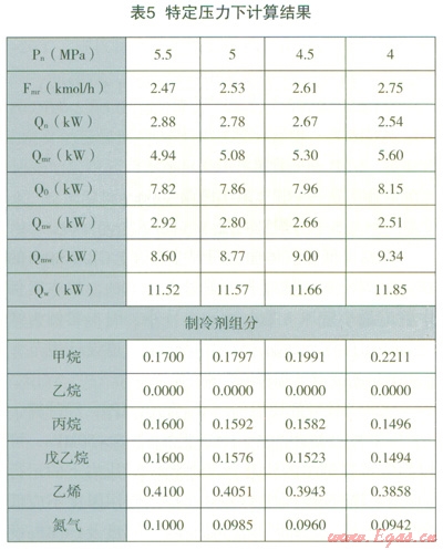 本文煤層氣組分為:甲烷98%、乙烷l%、氮?dú)?span lang="EN-US">1%、進(jìn)氣溫度20℃;制冷劑的基礎(chǔ)組分為:氮?dú)?span lang="EN-US">10%、甲烷l7%、乙烯41%、丙烷l6%、異戊烷16%;LNG的存儲(chǔ)壓力為0.38MPa。制冷劑循環(huán)量Fmr的計(jì)算方法如下:
