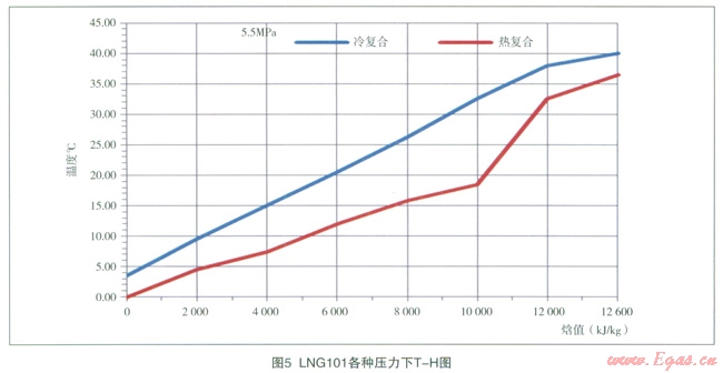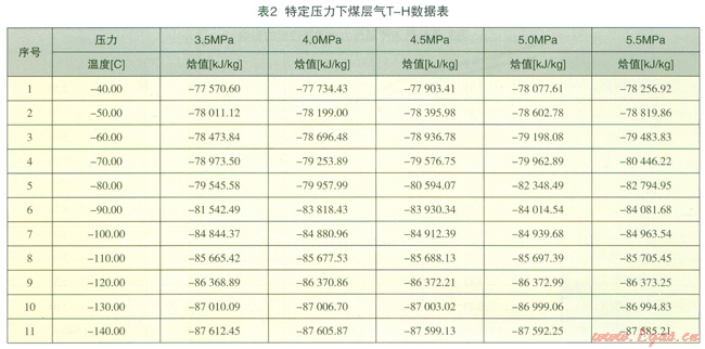 在特定壓力下,利用根據(jù)圖l建立的系統(tǒng)模型對(duì)煤層氣從初溫-40℃冷卻至-l40℃的過程中對(duì)煤層氣的T-H進(jìn)行模擬計(jì)算,結(jié)果詳見表2。