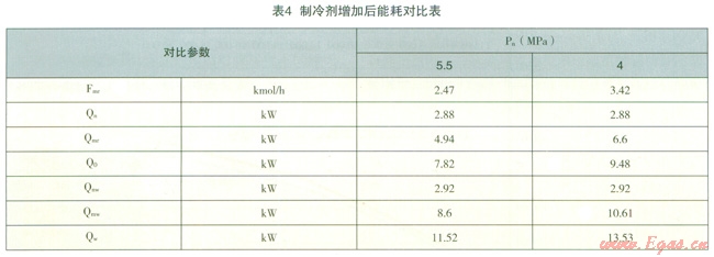 同時(shí)由圖4可以看出,隨著Pn的降低,原料氣的液化曲線不斷下移,而且愈加不平滑,由圖5~圖8可見換熱器(LNGl02)最小換熱溫差逐漸變小,當(dāng)壓力降至4.0MPa時(shí)最小溫差變?yōu)樨?fù)值,換熱器(LNGl02)無法收斂。此外由于換熱溫差減小,導(dǎo)致LNG換熱器的UA值不斷增大。對(duì)于已建工廠,由于換熱器的體積一定,且換熱器內(nèi)流體的流動(dòng)狀態(tài)、各項(xiàng)物性參數(shù)也不會(huì)發(fā)生太大變化,因此其UA值也基本是一個(gè)定值,因此此時(shí)若不對(duì)制冷劑組分進(jìn)行調(diào)整,則需增加制冷劑的循環(huán)量。在保證LNGl02換熱器UA基本不變的情況下增加制冷劑循環(huán)量處理每kmol原料氣的計(jì)算數(shù)據(jù)見表4。