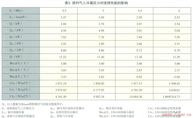 在煤層氣液化工藝中由于階式制冷工藝流程復(fù)雜,膨脹制冷工藝能耗偏高,混合制冷工藝逐步成為煤層氣液化領(lǐng)域的選擇趨勢(shì)。在混合制冷工藝中由于涉及的設(shè)備眾多,整個(gè)流程比較復(fù)雜,本文以某液化工廠流程原料氣進(jìn)冷箱的壓力對(duì)制冷劑的組分、制冷劑循環(huán)量、壓縮機(jī)功耗及冷卻水帶走熱量等性能參數(shù)的影響。從而通過合理選擇工藝參數(shù)使壓縮機(jī)的功耗降低,提高效率。