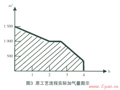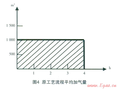 改進(jìn)工藝流程平均加氣量圖示:上部為管束氣瓶直接加入CNG汽車天然氣氣量,下部為經(jīng)壓縮機(jī)壓縮的加氣量;改進(jìn)工藝流程后加氣量由1000m3/h增加到1500m3/h;一輛管束車卸氣時間由原4h/車縮短到3h/車以內(nèi);改進(jìn)工藝流程后相對減少了壓縮機(jī)開機(jī)時間,減少了壓縮機(jī)的磨損并降低了能耗,實現(xiàn)了壓縮機(jī)在原有排氣量不變情況下提高加氣量的目的。