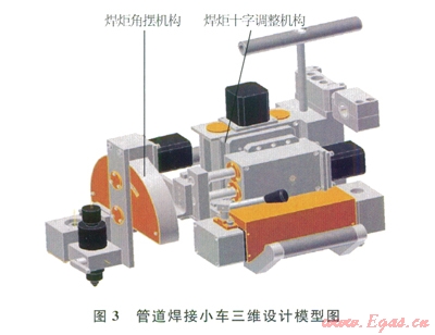 焊接小車主要由焊炬角擺機(jī)構(gòu)與焊炬十字調(diào)整機(jī)構(gòu)構(gòu)成(圖3)。其中,焊炬角擺機(jī)構(gòu)可實現(xiàn)焊炬最佳的角擺角度和擺動頻率,有效避免焊接過程中產(chǎn)生未熔缺陷;焊炬十字調(diào)整機(jī)構(gòu)可實現(xiàn)焊炬上下位置的調(diào)整與相對于焊縫寬度的左右位置調(diào)整,以滿足管道焊縫不同位置焊絲與管壁的間距要求及寬度要求。