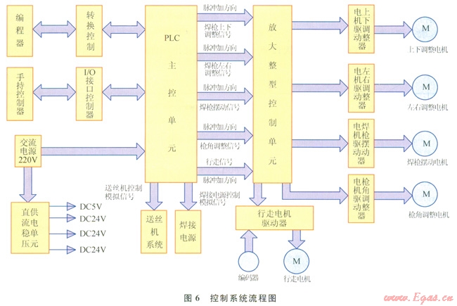 通過手持控制器可選擇具體的焊接工序及各種控制按鈕,經(jīng)I/O總線進(jìn)行控制命令的發(fā)送(圖6)。所有焊接參數(shù)均寫入編程器中,并通過轉(zhuǎn)換控制單元傳輸。信號最終傳輸給PLC主控單元進(jìn)行處理,經(jīng)放大給整形單元整形后傳輸給各電機(jī)驅(qū)動器,進(jìn)而對相應(yīng)電機(jī)進(jìn)行運動控制。