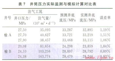 榆林南注采試驗井榆A和榆B井注氣過程中,井筒壓力損失分析見表7所示,計算壓力損失與實測的誤差小于2%?,F(xiàn)場試驗表明,室內(nèi)節(jié)點分析軟件模擬計算結(jié)果符合氣井實際運行工況。