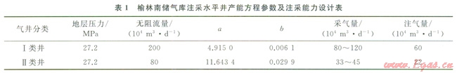 由于儲層非均質(zhì)性強,氣井產(chǎn)能存在差異,榆林南儲氣庫注采井按照采氣量2類井(表1)設(shè)計。氣井二項式產(chǎn)能方程[2]如下: