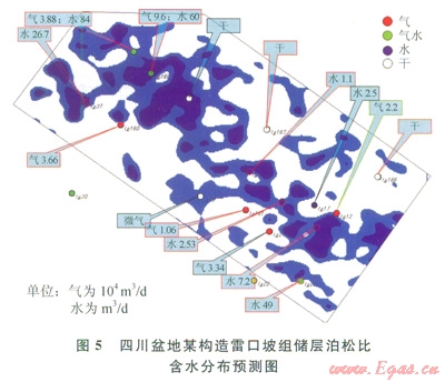 圖5為預(yù)測(cè)的含水分布預(yù)測(cè)圖。圖5中,5口純產(chǎn)氣井和3口氣水同產(chǎn)井有7口位于預(yù)測(cè)的含氣分布區(qū),有l口井不符合,4口純產(chǎn)氣井均不在預(yù)測(cè)的含水部位,4口干井有2口處于預(yù)測(cè)的含水部位。16口井有3口井不符合(符合率為81%)。