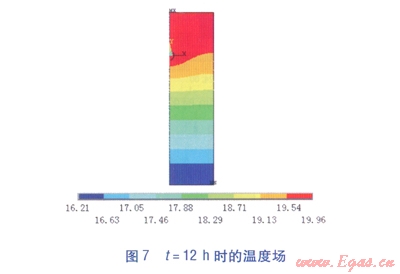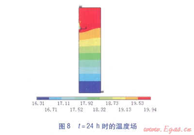 通過有限元軟件模擬了管道氣密性試驗(yàn)過程24h內(nèi)的溫度場(chǎng)分布,不同時(shí)刻的溫度場(chǎng)分布見圖3~8,t為模擬的時(shí)間,云圖下方彩色標(biāo)尺的顏色深淺表示溫度的高低,數(shù)值表示溫度值,單位為℃。