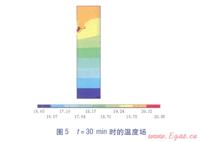 ①運(yùn)用有限元軟件ANSYS的熱分析功能,模擬得到了埋地管道氣密性試驗(yàn)過程中溫度場(chǎng)隨時(shí)間的變化情況:試驗(yàn)開始階段,管道溫度下降較快,30min后,管道溫度下降速度減緩,經(jīng)過1.5h后,管內(nèi)外溫度場(chǎng)基本達(dá)到穩(wěn)定。