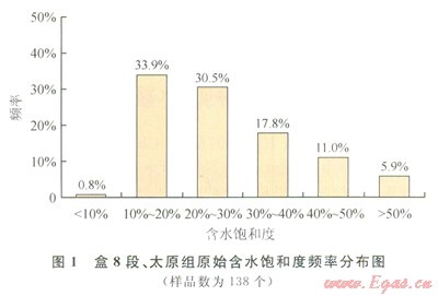 儲層原始含水飽和度由密閉取心井確定。通過統(tǒng)計、分析盆地東部3口密閉取心井盒8段、太原組的138個原始含水飽和度數(shù)據(jù),結(jié)果表明,盒8段、太原組的原始含水飽和度主要分布在40%以下,累計頻率町達(dá)83.1%,平均含水飽和度為26.7%(圖1)。具有較低的原始含水飽和度特征。
