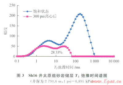 核磁共振呵動流體實驗原理是通過對儲層孔隙流體中氫核信號的觀測,可以贏接測量巖石中流體特性。并能獲得儲層有效孔隙度、自由流體和束縛流體體積、孔隙結(jié)構(gòu)等地質(zhì)信息[8-12]。巖心樣品飽和流體后置于均勻分布的靜磁場中,流體中的氫核(1H)會被磁場極化,產(chǎn)生磁化矢量,此時對樣品施加一定頻率的射頻場,就會產(chǎn)生核磁共振;撤掉射頻場就會接收到氫核在孔隙中做弛豫運動幅度隨時間以指數(shù)函數(shù)衰減的信號。核磁共振信號衰減的快慢采用橫向弛豫時間T2來描述,飽和流體的巖樣進(jìn)行核磁共振T2測試時,T2弛豫時間的大小取決于流體分子受孔隙固體表面作用力的強(qiáng)弱,因此利用核磁共振了T2譜可對巖樣孔隙內(nèi)流體的賦存狀態(tài)進(jìn)行分析,能夠定量測試出可動流體飽和度及束縛流體飽和度。圖3為Shl6井太原組砂巖儲層核磁共振實驗的T2弛豫時間譜圖,可以確定,該砂巖儲層的束縛水飽和度為28.33%。