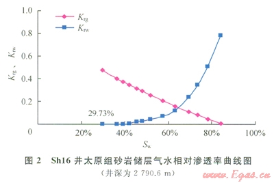 應(yīng)用氣水相滲和核磁共振2種實驗技術(shù)方法測試束縛水飽和度。氣水相對滲透率曲線在水相滲透率為0處對應(yīng)的含水飽和度即為束縛水飽和度,圖2為Shl6井太原組砂巖儲層的氣水相對滲透率曲線,可以確定該砂巖儲層的束縛水飽和度為29.73%。
