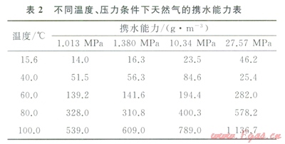 氣藏形成跨越相當(dāng)長的地質(zhì)時間,地層條件下氣藏中天然氣中的含水量取決于地層的溫度和壓力。在氣藏形成初期,溫度和壓力較低,但隨著埋藏深度增加,溫度壓力升高,天然氣攜水的能力不斷增強(qiáng)(表2),據(jù)Bennion[13]等研究,27.57MPa、100℃時天然氣蒸發(fā)和攜帶水的能力為ll36.7g/m3,而在1.013MPa、15.6℃時的能力僅為14.0g/m3,隨著溫度、壓力的增大,天然氣攜水的能力顯著增加。