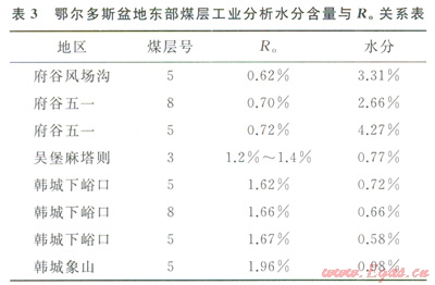 水在煤中的賦存狀態(tài)分為外在水分、內(nèi)在水分以及同煤中礦物質(zhì)結(jié)合的結(jié)晶水。煤層工業(yè)分析水分含量是指煤層中的內(nèi)在水分,內(nèi)在水分是指吸附或凝聚在煤顆粒內(nèi)部毛細(xì)孔中的水。通過對鄂爾多斯盆地東部煤層工業(yè)分析水分含量與有機(jī)質(zhì)成熟度(R。)關(guān)系時發(fā)現(xiàn)(表3),在R。>1.2%時,煤中水分含量明顯降低,預(yù)示著后期烴源巖中生成的天然氣中水蒸氣的含量越少,并處在欠飽和狀態(tài),而該區(qū)上古生界煤系烴源巖演化程度普遍達(dá)到高成熟和過成熟階段,在天然氣成藏后期會有更多的干氣注入儲層,導(dǎo)致儲層中的束縛水蒸發(fā)遷移,有利于形成超低含水飽和度氣藏。