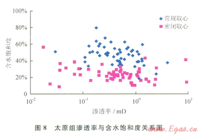 只要進(jìn)入儲層的水相流體的飽和度超過儲層水相流體的原始飽和度,就會引起儲層水鎖傷害。通過密閉取心含水飽和度與常規(guī)取心含水飽和度對比發(fā)現(xiàn):太原組和盒8段密閉取心含水飽和度一般低于40%(圖7、圖8);在不同滲透率區(qū)間,密閉取心含水飽和度均小于常規(guī)取心含水飽和度,表明鄂爾多斯盆地東部致密儲層普遍存在吸水現(xiàn)象及水基鉆井液的傷害,鉆井過程就已普遍存在著水鎖傷害。