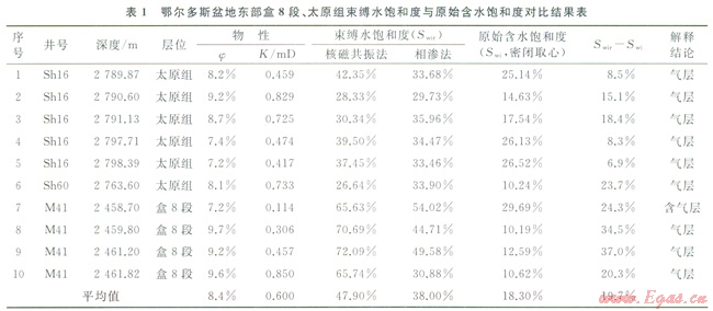 選取鄂爾多斯盆地東部的Shl6、Sh60井和M4l片盒8段、太原組的l0塊密閉取心樣品,開展氣水相滲、核磁共振實驗測試,將密閉取心所測試的儲層原始含水飽和度與采用氣水相滲、核磁共振實驗所確定的束縛水飽和度進(jìn)行了對比。