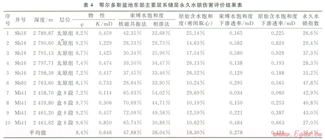 10塊巖心樣品的評價結(jié)果顯示(表4),永久性水鎖滲透率傷害率最小為26.6%,最大為47.8%,平均為35.4%;原始含水飽和度下氣相滲透率是束縛水飽和度下氣相滲透率的l.4~1.9倍,平均為1.6倍。因此設(shè)法預(yù)防和解除永久性水鎖傷害,恢復(fù)原始含水飽和度下的氣相滲透率,對提高相同儲層物性條件的儲層氣相滲透率和提高單井產(chǎn)量有著重要的意義。