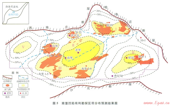 南堡凹陷油氣成藏概率大于70%的地區(qū)在各油氣成藏體系中均有分布,這也表明,該區(qū)各油氣成藏體系均存在有利的勘探區(qū)。其中,南堡Ⅱ號(hào)和南堡Ⅲ號(hào)油氣成藏體系的分布范圍最廣;其次為南堡Ⅰ號(hào)和南堡Ⅳ號(hào)油氣成藏體系;南堡V號(hào)成藏體系的分布范圍相對(duì)較小。南堡Ⅰ號(hào)油氣成藏體系中,現(xiàn)今已發(fā)現(xiàn)的油氣藏主要位于該區(qū)有利勘探區(qū)帶的預(yù)測(cè)范圍內(nèi);南堡Ⅱ號(hào)和南堡Ⅲ號(hào)油氣成藏體系中,現(xiàn)今已發(fā)現(xiàn)的油氣藏基本上位于有利勘探區(qū)帶預(yù)測(cè)范圍的外圍部位,這些部位基本上屬于構(gòu)造高部位,而被這些構(gòu)造高部位包圍的地區(qū)仍是有利的潛在勘探區(qū)(圖5),該區(qū)主要包挺括了南堡凹陷最大的次凹——林雀次凹。林雀次凹臣厚的泥(頁(yè))巖中發(fā)育火量的濁積砂體,這些砂體自沉積初始期就被烴源巖包圍,容易形成透鏡體油氣藏。在次凹邊緣斜坡的不整合面部位,發(fā)育分選磨圓較好的孔隙性砂巖,隨水體加深,在砂層之上超覆了不滲透的泥巖便形成了地層超覆類圈閉。其次,林雀次凹的深部位還具有形成非常規(guī)氣藏的地質(zhì)條件,如頁(yè)巖氣、深盆氣已經(jīng)開(kāi)始引起重視[36]。南Ⅳ號(hào)和南堡V號(hào)油氣成藏體系的油氣勘探程度低,發(fā)現(xiàn)的油氣較少。但仍然存在油氣勘探柑利區(qū)(圖5)。因此,南饅凹陷最有利的潛在勘探區(qū)是林雀次凹及其周邊地區(qū),其次為南堡Ⅳ號(hào)和南堡V號(hào)油氣成藏體系。
