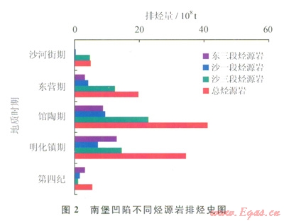 南堡凹陷3套烴源巖熱演化程度有所差異,因此不同烴源巖的主要排烴時(shí)期和排烴量也存在差異(圖2)。沙三段烴源巖發(fā)生大規(guī)模排烴的時(shí)間較早,在沙河街組沉積期就發(fā)牛一定規(guī)模的排烴過(guò)程,東營(yíng)組沉積期以來(lái)發(fā)生了大規(guī)模的排烴過(guò)程;沙一段和東三段烴源巖發(fā)生大規(guī)模排烴的時(shí)間較晚,其大規(guī)模排烴的時(shí)間主要集中在館陶組沉積期以來(lái)。總的來(lái)說(shuō)東營(yíng)期、館陶期和明化鎮(zhèn)期是主要的排烴期,且3套烴源巖均只有1次排烴高峰期,說(shuō)明南堡凹陷只有1次主要成藏期。且至今仍在成藏過(guò)程中,這和前人利用烴類流體包裹體均一化溫度分析結(jié)果一致。南堡凹陷發(fā)生油氣充滓過(guò)程的時(shí)間跨度大,從東營(yíng)組沉積時(shí)期至第四系沉積時(shí)期均有油氣成藏[20]。