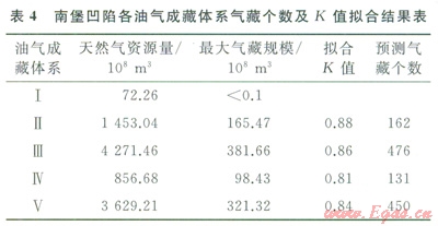 K值的大小關(guān)系到所預(yù)測(cè)氣藏的個(gè)數(shù)及氣藏的規(guī)模。在K值的獲取過(guò)程中,普遍采用的方法是依據(jù)已發(fā)現(xiàn)油氣藏的儲(chǔ)量和規(guī)模數(shù)據(jù)來(lái)進(jìn)行擬合,因此所需要的油氣藏?cái)?shù)據(jù)較多。而南堡凹陷已發(fā)現(xiàn)的油氣藏個(gè)數(shù)總體并不太多,尤其氣藏個(gè)數(shù)更少,因此,有必要對(duì)K值的求取方法進(jìn)行改進(jìn)。針對(duì)南堡凹陷各油氣成藏體系,本次研究基于渤海灣盆地油氣資源動(dòng)態(tài)評(píng)價(jià)的認(rèn)識(shí),將l5×104t油氣當(dāng)量的油氣藏作為商業(yè)油氣勘探開(kāi)發(fā)的下限(最小油氣藏規(guī)模),以儲(chǔ)量規(guī)模最大的油(氣)藏為第l序號(hào)油氣藏,取任意K值進(jìn)行擬合,K值的最終確定需要滿足以下2個(gè)條件:①使得最大序號(hào)油(氣)藏的儲(chǔ)量接近l5×104t;②所有油氣藏的儲(chǔ)量之和接近成藏體系的油氣資源總量。由此擬合得到K值和油氣藏個(gè)數(shù),表4為南堡凹陷各成藏體系氣藏個(gè)數(shù)與K值擬合結(jié)果,其中南堡Ⅲ號(hào)成藏體系氣藏的個(gè)數(shù)最多,為476個(gè)。