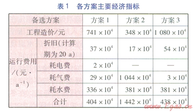 按照各方案的系統(tǒng)設備組成估算造價,同時結(jié)合各方案的運行要求,測算年水、電、氣的消耗費用。各方案主要經(jīng)濟指標見表1。