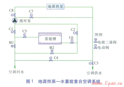 近年來,隨著霍辯的不斷發(fā)展和人們對(duì)低碳環(huán)保的重視,地源熱泵憑借獨(dú)特的優(yōu)勢(shì)得到越來越廣泛的應(yīng)用。如今地源熱泵的研究已經(jīng)比較成熟,但其仍面臨著取能蓄能難以平衡,不能有效利用電力峰谷差價(jià)的問題[1]。水蓄能裝置可以有效利用電力的峰谷差價(jià),但其應(yīng)用具有一定的局限性[2]?;谝陨峡紤],將地源熱泵和水蓄能技術(shù)相結(jié)合,形成地源熱泵一水蓄能復(fù)合空調(diào)系統(tǒng),本文對(duì)該系統(tǒng)進(jìn)行研究。
