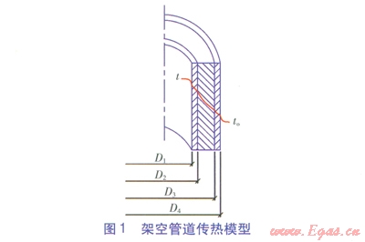 架空敷設(shè)熱水供熱管道(以下簡(jiǎn)稱(chēng)架空管道,由工作鋼管、保溫層、保護(hù)層構(gòu)成)傳熱模型見(jiàn)圖l,單位長(zhǎng)度架空管道熱損失q的計(jì)算式為[1]: