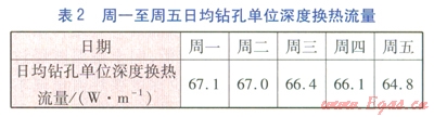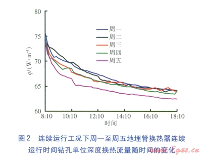 連續(xù)運行工況下,周一至周五地埋管換熱器連續(xù)運行時間鉆孔單位深度換熱流量隨時間的變化見圖2。由圖2可知,隨著時間推移,鉆孔單位深度換熱流量整體呈下降趨勢,雖然周一二這種變化并不明顯,但從周三開始,特別是周五,地埋管換熱器的換熱能力已有明顯降低。前一日運行結(jié)束時的鉆孔單位深度換熱流量較低,但次日基本能恢復(fù)至前一日開始運行時的水平。周一至周五日均鉆孔單位深度換熱流量見表2。由表2可知,經(jīng)過5d的連續(xù)運行,鉆孔單位深度換熱流量從67.1W/m下降至64.8W/m,下降幅度為3.4%。