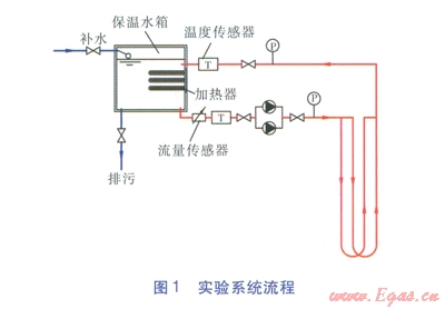 實驗系統(tǒng)流程見圖l。地埋管換熱器進水溫度恒定在30℃,水的流速基本穩(wěn)定在0.5m/s。鉆孔深度l00m,地埋管換熱器布置為雙U形,采用PE管,外直徑為32mm,壁厚為3mm。在地埋管換熱器進出水管道上分別設(shè)置溫度傳感器,并在鉆孔距地面0.5、2.5、4.5、9.5、14.5、24.5、44.5、64.5、94.5m處設(shè)溫度測點,測量土壤溫度。數(shù)據(jù)采集時間間隔為l0min,實測土壤初始平均溫度為l9.8℃。
