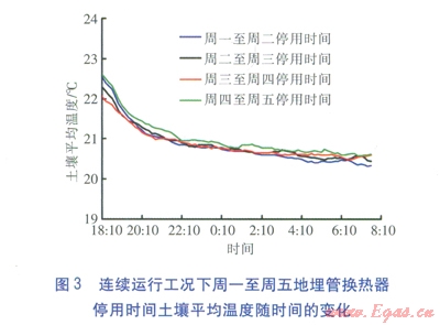 連續(xù)運行工況下周一至周五地埋管換熱器停用時間土壤平均溫度隨時間的變化見圖3。由圖3可知,土壤溫度的恢復(fù)是一個由快變慢的過程。在地埋管換熱器停用后,前4h土壤平均溫度快速下降,之后下降幅度明顯變緩。由于連續(xù)運行,土壤平均溫度整體上有逐漸升高的趨勢。由實測結(jié)果可知,從周五地埋管換熱器停用到下一周運行開始,土壤經(jīng)過62h的恢復(fù),土壤平均溫度從23.0℃下降至20.2℃,為下一周的運行提供了有利條件。