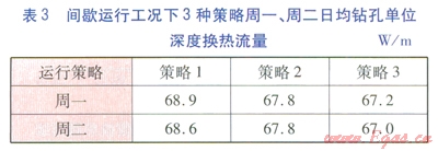 間歇運行工況下3種策略周一、周二日均鉆孔單位深度換熱流量見表3。由表3可知,與連續(xù)運行工況相比,間歇運行工況3種策略的地埋管換熱器換熱能力均有所改善。策略1、2的地埋管換熱器換熱能力優(yōu)于策略3,這表明地埋管換熱器停運時間越長,越有助于改善其換熱能力。策略l、2均為全天運行6h,但策略l的地埋管換熱器換熱能力卻高于策略2。這說明,在一段時間內(nèi),采取相對分散的土壤溫度恢復(fù)時間比采取相對集中的土壤溫度恢復(fù)時間效果更好。