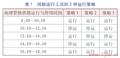采用恒定地埋管換熱器進水溫度的方法,實驗?zāi)M夏季工況下地埋管換熱器在連續(xù)運行工況、間歇運行工況下的換熱能力。對于連續(xù)運行工況,地埋管換熱器在周一至周五的8:10—l8:10連續(xù)運行,其他時間停用。對于間歇運行工況,地埋管換熱器在周一至周五的8:10—18:10間歇運行,其他時間停用,并設(shè)計了3種運行策略(見表l)。