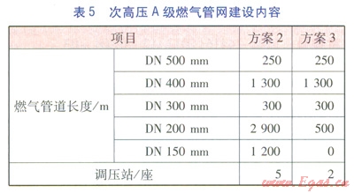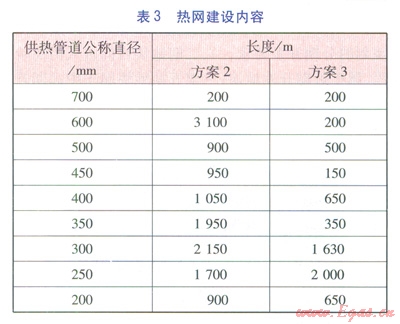 方案l~3各分項(xiàng)工程建設(shè)內(nèi)容分別見表2~6。表3中的熱網(wǎng)指一級管網(wǎng),由于二級管網(wǎng)(包括分散式低溫燃?xì)忮仩t房至熱用戶的管網(wǎng))造價(jià)由用戶分?jǐn)?,因此不?jì)入熱網(wǎng)造價(jià)中。由表2~6可計(jì)算得出方案l~3的工程造價(jià)分別為35237.74×104、43004.35×104、41047.11×104元。