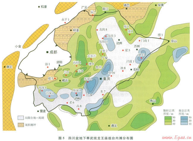 兩類構(gòu)造背景下發(fā)育的臺內(nèi)灘均可規(guī)模分布。例如四川盆地寒武系龍王廟組,初步預(yù)測顆粒灘僅在磨溪、高石梯、龍女寺、威遠(yuǎn)地區(qū)分布面積就達(dá)到3.7×104km2,嘉陵江組顆粒灘的分布面積也有5×104~6×104km2[5]。
