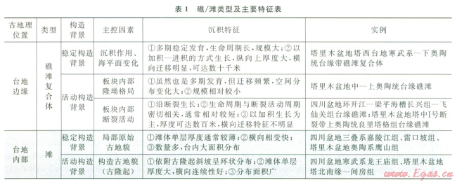 根據(jù)礁、灘所處的古地理位置,可以分為臺緣礁/灘和臺內(nèi)礁/灘,它們在發(fā)育位置、規(guī)模、形態(tài)和空間分布等方面有很大不同。塔里木盆地、四川盆地臺緣礁灘和臺內(nèi)灘均有大面積分布,是油氣勘探尋找的有利相帶,因此筆者將重點(diǎn)討論臺緣礁灘和臺內(nèi)灘在不同構(gòu)造背景下的發(fā)育特征。