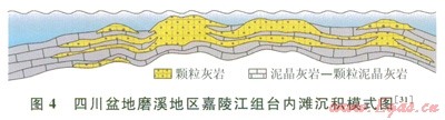 以四川盆地下三疊統(tǒng)嘉陵江組為例,顆粒灘在臺地內(nèi)部十分發(fā)育,其分布主要受臺內(nèi)原始古地貌和海平面變化控制[32]。盆地內(nèi)不同地區(qū)臺內(nèi)灘發(fā)育特征有差異,但總體上具有以下特點(diǎn):顆粒含量高,以砂屑和鮞粒為主;交錯(cuò)層理普遍發(fā)育;垂向上形成向上變淺的沉積序列;海侵期顆粒灘發(fā)育時(shí)間短,規(guī)模相對較小,灘體厚度多為l~3m;高位域顆粒灘規(guī)模較大,厚度介于1~8m。