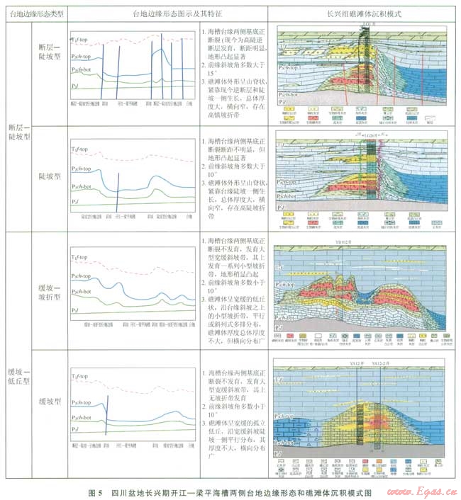 1)長興期,開江—梁平海槽兩側(cè)臺(tái)地邊緣主要存在4種形態(tài),即斷層陡坡型臺(tái)地邊緣、陡坡型臺(tái)地邊緣和緩坡坡折型臺(tái)地邊緣和緩坡型臺(tái)地邊緣,這4種形態(tài)的臺(tái)地邊緣是影響臺(tái)緣帶礁灘體沉積模式和成巖作用特征的關(guān)鍵要素,也是造成礁灘體儲(chǔ)層特征差異性的根本原因。