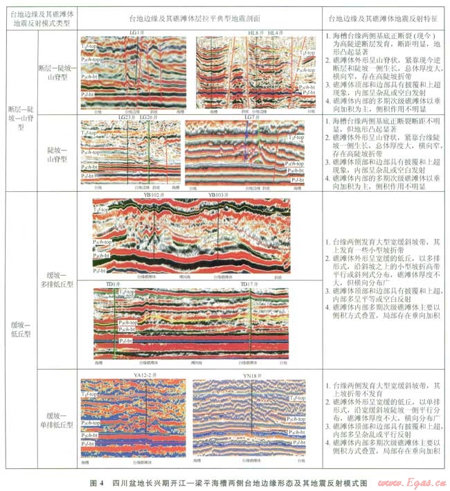 為建立不同臺(tái)緣帶長興組礁灘體沉積模式,科學(xué)指導(dǎo)礁灘體儲(chǔ)層預(yù)測,筆者利用前緣斜坡角變化、礁灘體地震反射特征、坡折帶發(fā)育程度以及長興組厚度變化等成果,根據(jù)礁灘體發(fā)育的主控因素,將開江梁平海槽兩側(cè)臺(tái)地邊緣形態(tài)劃分為斷控陡坡型和緩坡型2大類,包含斷層一陡坡型臺(tái)地邊緣、陡坡型臺(tái)地邊緣和緩坡—坡折型臺(tái)地邊緣、緩坡型臺(tái)地邊緣4種類型,每種類型的主要特征如圖5所述??傊L興期開江梁平海槽兩側(cè)臺(tái)地邊緣形態(tài)整體表現(xiàn)為箕形,具體特征是:海槽向NW方向敞開且逐漸加深,向SE方向變淺變緩且收口;海槽北段和中段局部地區(qū)臺(tái)地兩側(cè)的外形輪廓基本對(duì)稱,明顯受基底斷裂控制,臺(tái)緣帶呈山脊?fàn)钋彝蛊痫@著,發(fā)育明顯坡折帶;海槽南段兩側(cè)臺(tái)地邊緣的外形輪廓呈現(xiàn)西陡南緩的不對(duì)稱箕形,基底斷裂不發(fā)育,臺(tái)緣帶呈寬緩低丘,坡折帶不明顯。