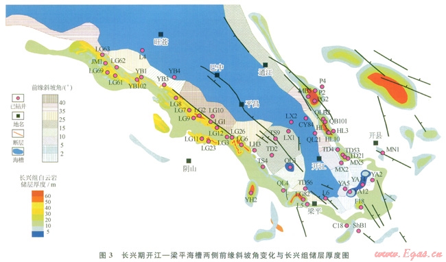 圖3是利用以上方法得到的開江 梁平海槽兩側(cè)臺(tái)地前緣斜坡角大小的粗略圖。該圖顯示,開江梁平海槽兩側(cè)前緣斜坡角度變化自北向南呈現(xiàn)不均一變化,海槽北部和中部臺(tái)地前緣斜坡角度相對(duì)較大,一般大于l0°,最大可達(dá)60°,海槽兩側(cè)臺(tái)地邊緣帶凸起明顯,發(fā)育明顯坡折帶;海槽南部前緣斜坡角度普遍較小,多數(shù)小于l0°,整體表現(xiàn)為西陡南緩的大型箕狀寬緩斜坡。