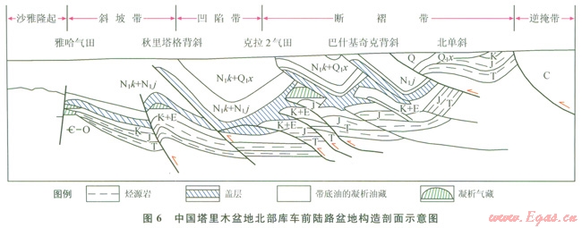 5)構造樣式:根據(jù)現(xiàn)有的物探、地質資料,將前陸盆地構造樣式劃分為8種構造模式:擠壓背斜、滑脫背斜、牽引背斜、斷背斜、背沖構造、雙重構造、疊瓦構造、鹽構造。