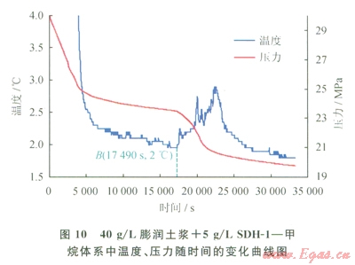 三元聚合物抑制劑SDH-lVPVC分子結構基礎上引入了強親水性基團,以增加聚合物的水溶性。圖9、10反映了加入SDH-1后膨潤土漿中水合物的生成過程。