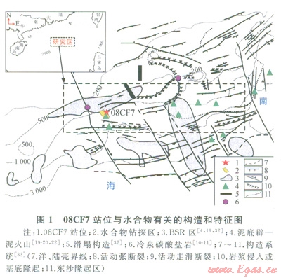 08CF7站位位于南海北部神狐海區(qū)。該海區(qū)位于南海北部陸坡中段,界于兩沙海槽和東沙群島之間,構造上處于珠江口盆地珠Ⅱ凹陷,自中新世以來進入構造沉降[30]。新生代沉積厚度介于1000~7000m,有機質(zhì)含量為0.2%~l.9%[5,29]。水深800~2000m,海底地形復雜且坡度變化較大。高分辨率地球物理調(diào)查表明,該海域廣泛發(fā)育斷裂一褶皺體系、泥火山、泥底辟等構造,且海底以下150~350m廣泛分布BSR,具有較好的水合物形成和賦存的地質(zhì)條件 [5,18,21],且于2007年在該海區(qū)成功鉆取到水合物實物樣品[31]。