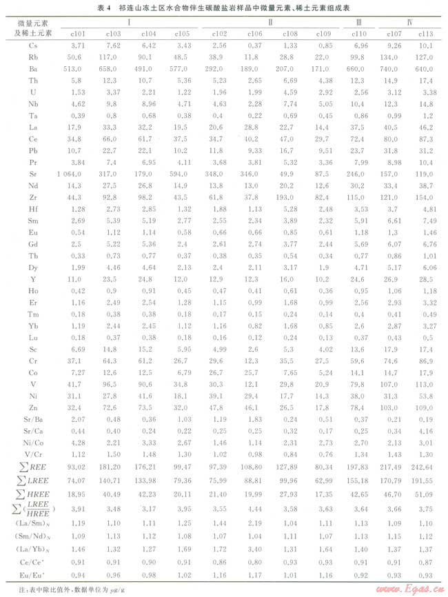 野外鉆探取樣過(guò)程中發(fā)現(xiàn)水合物常與碳酸鹽巖伴生,這一現(xiàn)象暗示了水合物可能與碳酸鹽巖之間存在著某種聯(lián)系。海底水合物分布區(qū)中伴生碳酸鹽巖中的碳普遍認(rèn)為主要來(lái)源于水合物分解釋放的甲烷,其次還可能來(lái)源于滲漏的甲烷氣體,或深部滲漏的重?zé)N(油)、沉積物中有機(jī)質(zhì)等被氧化產(chǎn)物。對(duì)祁連山凍土區(qū)伴生碳酸鹽巖中C、O同位素研究表明,第Ⅰ、Ⅲ、Ⅳ類(lèi)伴生碳酸鹽巖巾碳、氧同位素組成相關(guān),而第Ⅱ類(lèi)伴生碳酸鹽巖中碳、氧同位素組成相對(duì)獨(dú)立,第Ⅱ類(lèi)伴生碳酸鹽巖組成明顯不同于第Ⅰ、Ⅲ、Ⅳ類(lèi)伴生碳酸鹽巖[31],其伴生碳酸鹽巖礦物如方解石、文石、白云石中13C較大程度虧損指示著甲烷是其碳酸鹽巖的一個(gè)主要碳源[32-33]。顯微鏡下觀察發(fā)現(xiàn),第Ⅱ類(lèi)碳酸鹽巖中產(chǎn)出較多草莓狀黃鐵礦,這些特征表明有微生物參與沉積成巖,這也造成第Ⅱ類(lèi)碳酸鹽巖元素地球化學(xué)特征有別于其他類(lèi)型碳酸鹽巖。