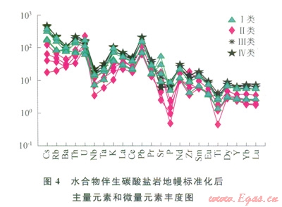 巖石化學(xué)蝕變指數(shù)(CIA)——CIA指數(shù)=[Al2O3/(A12O3+CaO+Na2O+K2O)]×100,表達(dá)了Al2O3(含鋁黏土礦物)、(CaO+Na2O)(斜長(zhǎng)石)和K2O(鉀長(zhǎng)石)含量之間的變化關(guān)系,反映出沉積烴源巖特征[27]。該區(qū)4類(lèi)碳酸鹽巖樣品中CIA指數(shù)分別約為32、36、44、72,第Ⅰ類(lèi)和第Ⅱ類(lèi)碳酸鹽巖中混入的碎屑部分程度最弱,因?yàn)檫@個(gè)原因,第Ⅱ類(lèi)碳酸鹽巖樣品中稀土元素含量最低(其平均約為l03.61mg/g,而第Ⅰ、Ⅲ、Ⅳ類(lèi)碳酸鹽巖樣品中稀土元素含量分別約為137.48mg/g、197.83mg/g、230.07mg/g),其樣品中主量元素和微量元素含量也相對(duì)最低(表3、4),即表明黏土礦物對(duì)該類(lèi)碳酸鹽巖形成過(guò)程中的貢獻(xiàn)最小。