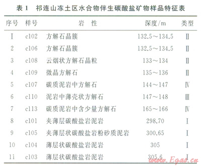 樣品采自青海祁連山木里凍土區(qū)水合物科學(xué)試驗(yàn)鉆探井不同深度巖心,共11件,其均產(chǎn)自水合物產(chǎn)出層段內(nèi)[24],樣品采集深度及地質(zhì)特征見(jiàn)表1。樣品本身為碳酸鹽巖、碳質(zhì)泥巖、泥巖等,其內(nèi)均含碳酸鹽礦物。按地質(zhì)產(chǎn)狀的不同,伴生碳酸鹽礦物在巖層中的賦存狀態(tài)可分成以下4種類(lèi)型:①白色薄層狀碳酸鹽巖(3~5cm厚),產(chǎn)出在水合物分布層段泥巖中(Ⅰ型,圖2-a);②煙灰色菱形晶簇狀方解石集合體,產(chǎn)出在水合物附近,或呈(云煙狀)微晶方解石(Ⅱ型,圖2-b);③深灰色薄殼狀碳酸鹽巖(小于lmm),產(chǎn)出在水合物層段內(nèi)泥巖微裂隙中(Ⅲ型,圖2-c);④微細(xì)浸染狀方解石或微量的碳酸鹽巖,賦存于碳質(zhì)泥巖等中(Ⅳ型,圖2-d)。樣品經(jīng)顯微鏡觀察和X射線(xiàn)粉晶衍射分析,伴生碳酸鹽巖主要由石英、白云石、云母、斜長(zhǎng)石、綠泥石、方解石和文石組成,如表2所示。