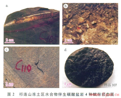 實(shí)際中,祁連山凍土區(qū)與水合物伴生的第Ⅰ、Ⅲ、Ⅳ類(lèi)碳酸鹽巖在鉆孔中產(chǎn)出深度在144~305m,主要屬江倉(cāng)組,為l套淺湖—半深湖環(huán)境的細(xì)碎屑泥巖、粉砂巖等。其中,第Ⅰ類(lèi)碳酸鹽巖旱白色薄層狀?yuàn)A層產(chǎn)出在泥巖層中,厚度介于3~5cm(圖2-a),第Ⅲ類(lèi)碳酸鹽巖呈深灰色薄殼狀產(chǎn)出在泥巖微裂隙中,厚度一般小于1mm(圖2-c),第Ⅳ類(lèi)碳酸鹽巖呈微細(xì)浸染狀賦存于炭質(zhì)(鈣質(zhì))泥巖等中(圖2-d),該類(lèi)碳酸鹽巖所在巖層新鮮面上肉眼可見(jiàn)白色絲狀非晶質(zhì),點(diǎn)滴鹽酸時(shí)出現(xiàn)強(qiáng)烈冒泡現(xiàn)象。