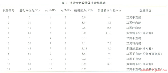 在定向射孔方位角由小變大的過程中,發(fā)現(xiàn)存在一個臨界角度,此時,定向射孔處和最大水平地應(yīng)力方向處的第一主應(yīng)力的大小相等,裂縫可能會同時在這兩個位置起裂[1,3]。實驗表明:在試件4、試件7和試件10中產(chǎn)生了非對稱多裂縫系統(tǒng),井眼一側(cè)是一條沿定向射孑乙起裂的轉(zhuǎn)向裂縫和一條白射孔孔眼根部與井壁的交匯處起裂、穿透水泥環(huán)一段距離后沿sH方向與井壁的交匯處起裂、延伸的單翼平直裂縫,井眼的另一側(cè)是沿定向射孔起裂的轉(zhuǎn)向裂縫(圖3)。而且在地應(yīng)力狀態(tài)一定的情況下,隨著定向射孔方位角的增大,由于水力裂縫的起裂困難和彎曲,產(chǎn)生人工水力裂縫所需的破裂壓力逐漸變大、水力裂縫的轉(zhuǎn)向半徑也越來越大;在產(chǎn)生非對稱多裂縫時,破裂壓力和裂縫轉(zhuǎn)向半徑均達到實驗的最大值(表1)。