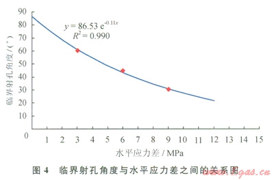 利用本壓裂模擬實驗結(jié)果,可回歸出產(chǎn)生非對稱多裂縫系統(tǒng)的臨界射孔角度和水平應(yīng)力差的相互關(guān)系曲線(圖4)。當水平應(yīng)力差和定向射孔方位角的坐標落在藍色臨界線的左下側(cè)時,人工水力裂縫會沿定向射孔方向起裂,形成一條基本對稱的雙翼平直裂縫或雙翼彎曲裂縫;當水平應(yīng)力差和定向射孔方位角的坐標落在藍色臨界線的右上側(cè)時,人工水力裂縫會沿著最大水平地應(yīng)力方向起裂,產(chǎn)生一條穿過微環(huán)面的雙翼平直裂縫;當水平應(yīng)力差和定向射孔方位角的坐標正好落在藍色臨界線上時,人工水力裂縫可能沿著定向射孔方向和最大水平地應(yīng)力方向多點同時起裂,形成非對稱多裂縫系統(tǒng)。該預(yù)測結(jié)果與本文參考文獻[3]的有限元模擬計算結(jié)果比較一致。運用該圖可以用來預(yù)測定向射孔水力壓裂裂縫形態(tài),為現(xiàn)場壓裂施工提供參考。但鑒于實際地層因素和完井因素的影響,實際的臨界射孔角度可能會有所變化。