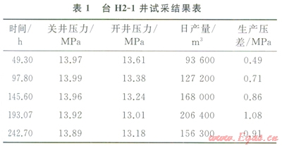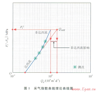 接著用采氣指數(shù)法對(duì)該井進(jìn)行滲流動(dòng)態(tài)描述[3]。該方法主要根據(jù)滲流力學(xué)原理,將氣體滲流控制在達(dá)西流的范圍內(nèi),以達(dá)到保護(hù)儲(chǔ)層、避免出砂的目的。根據(jù)臺(tái)H2-1井的試采數(shù)據(jù),其臨界點(diǎn)在生產(chǎn)壓差lMPa(即地層壓力的7%左右),在此生產(chǎn)壓差下其日產(chǎn)量為16×104m3,也即理論上的最高配產(chǎn)量(圖1)。