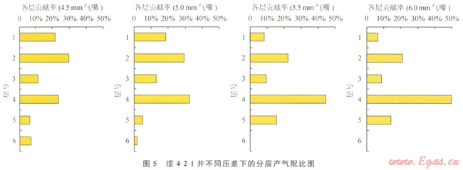 該技術(shù)需要首先進(jìn)行地質(zhì)研究,根據(jù)地層系數(shù),得到各層理論產(chǎn)出配比情況。研究結(jié)果認(rèn)為:4、5號(hào)層為該井的主力氣層。然后根據(jù)不同工作制度序列,進(jìn)行產(chǎn)氣剖面測(cè)試,獲得不同壓差下的分層相對(duì)產(chǎn)氣配比情況(圖5)。